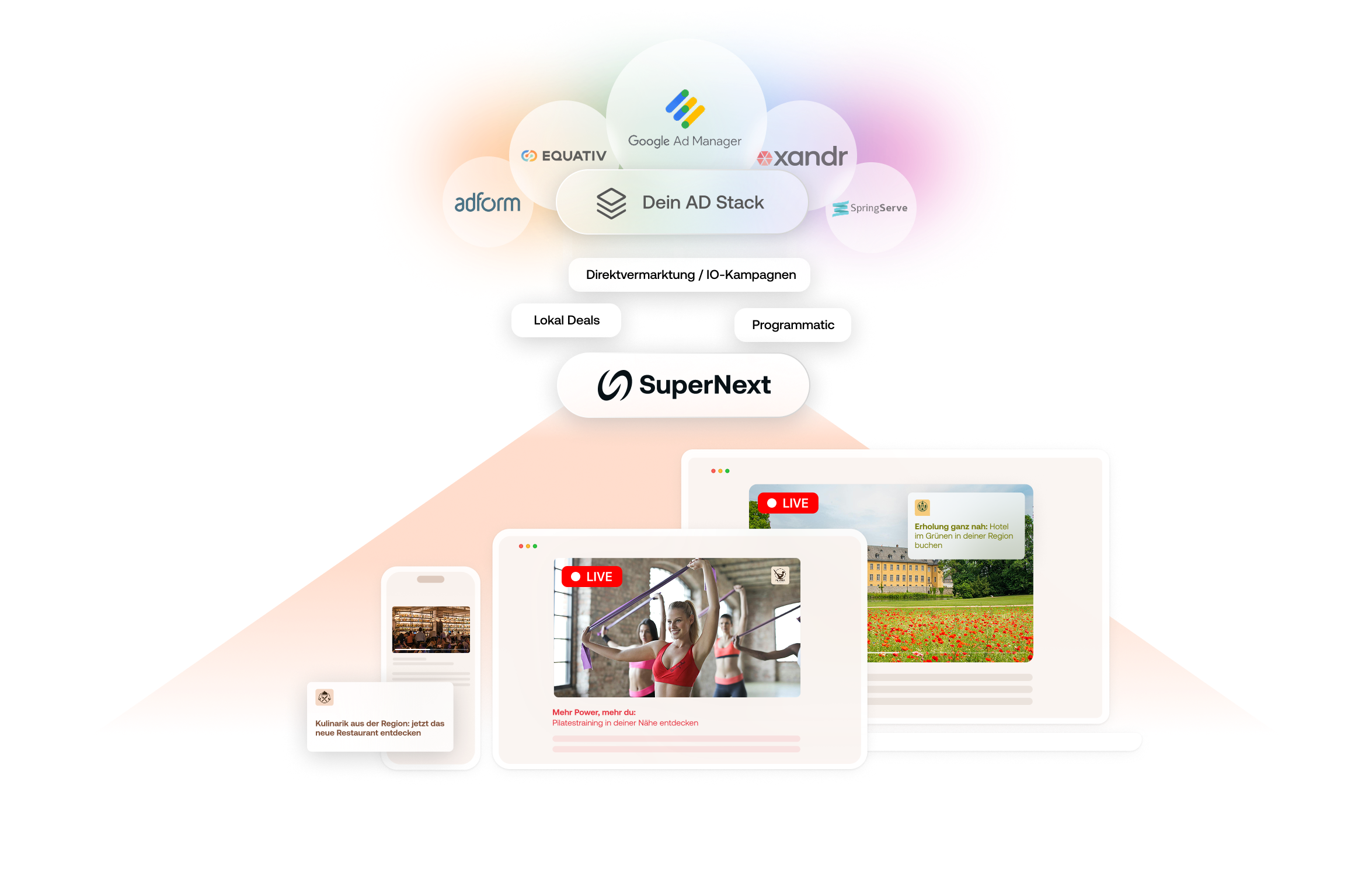 Dein Fokus liegt auf Content – wir übernehmen die Livestream-Vermarktung. SuperNext bündelt hochwertigen Demand und übernimmt Ausspielung, Optimierung und Abrechnung für dich. Du konzentrierst dich auf Inhalte – wir sorgen für die Vermarktung: voll automatisiert, transparent und nahtlos integriert.
